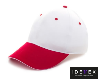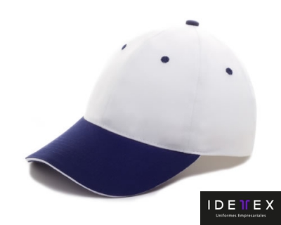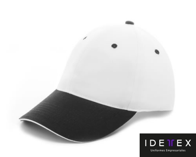 Gorra de gabardina 100% algodón, canto de visera en contraste, botón forrado, ajuste de velcro y puntada frontal de seguridad.