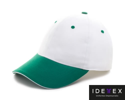 Gorra de gabardina 100% algodón, canto de visera en contraste, botón forrado, ajuste de velcro y puntada frontal de seguridad.